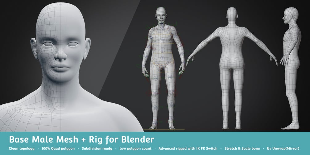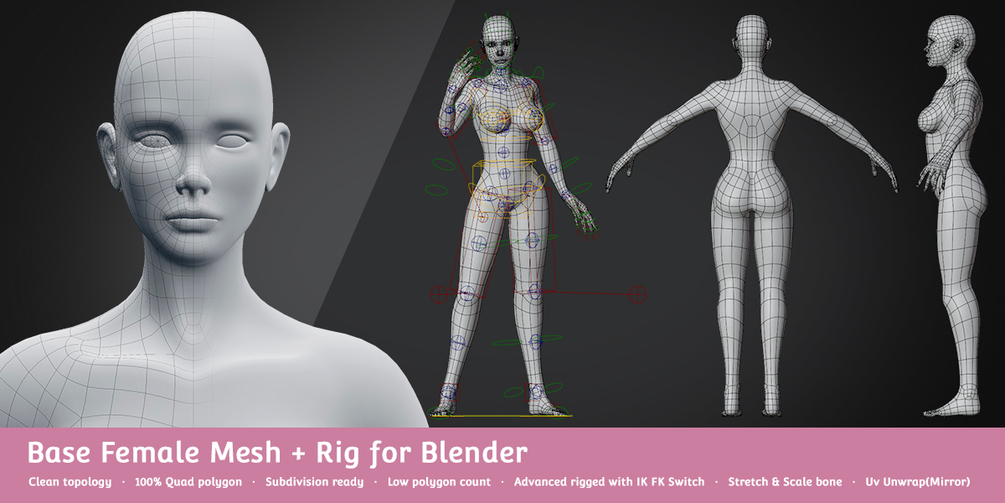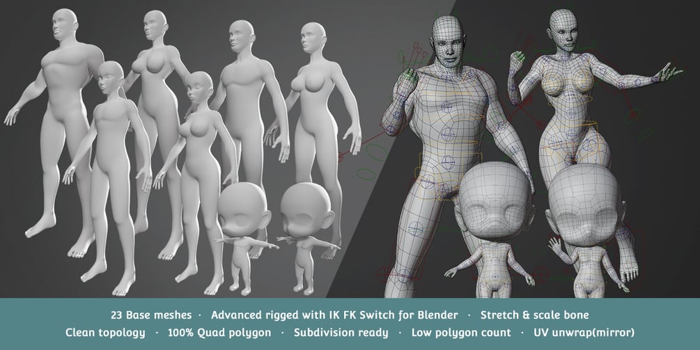 Includes 23 the most basic character meshes set and advanced rigged for Blender to help increase your productivity! A good base mesh allows you to save time with good proportions, clean topology and clean paint weight.